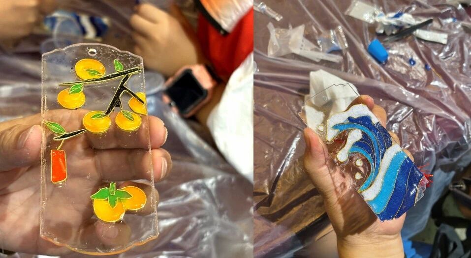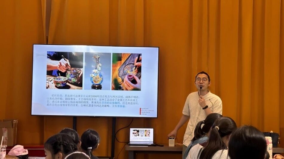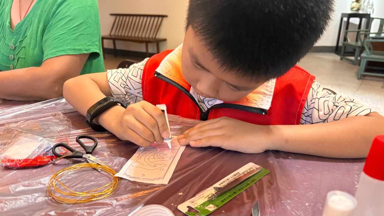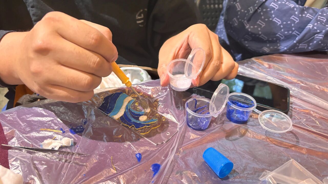 参观结束后,活动进入非遗体验环节——掐丝珐琅手工实践。在专业教师的指导下,各组家庭共同体验这一传统工艺的制作流程与艺术特色。孩子们专注地用镊子弯折金丝、勾勒纹样,家长则在旁协助鼓励,亲子之间默契配合,共同完成一道道繁复精美的图案。随后的点蓝环节更需亲子协同操作,大手与小手一起执起滴管,将彩料填充于金丝之间,既传承了技艺,也深化了情感的交流。