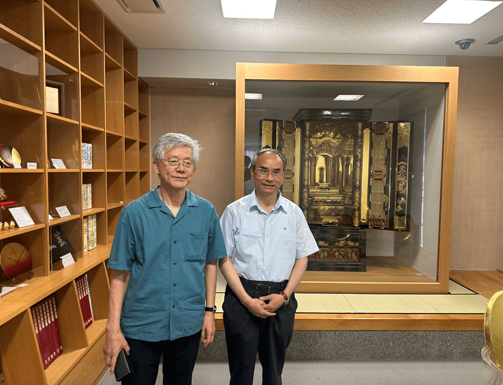 8月11日,在此行最后一日,代表团专程至日本天台宗大本山比叡山延历寺参访。该寺执行(住持)狮子王圆明和管理部长青木元学、国宝殿主任研究员宇代贵文等专门会见了代表团一行。双方就后续举办延历寺三代座主圆仁书画展事宜进行了深入的交流。随后,代表团参观了该寺的根本中堂、国宝殿等相关设施。