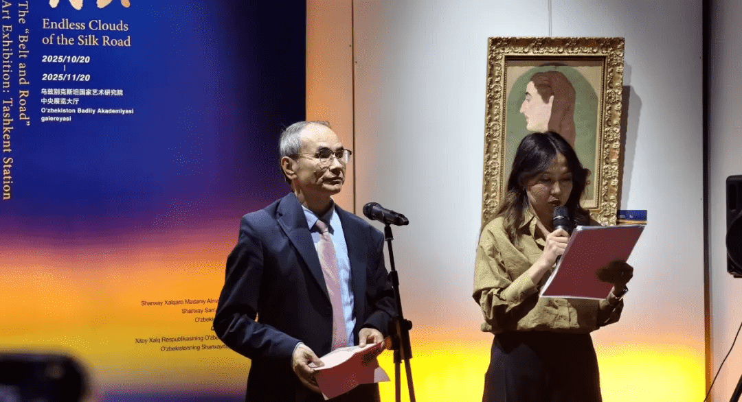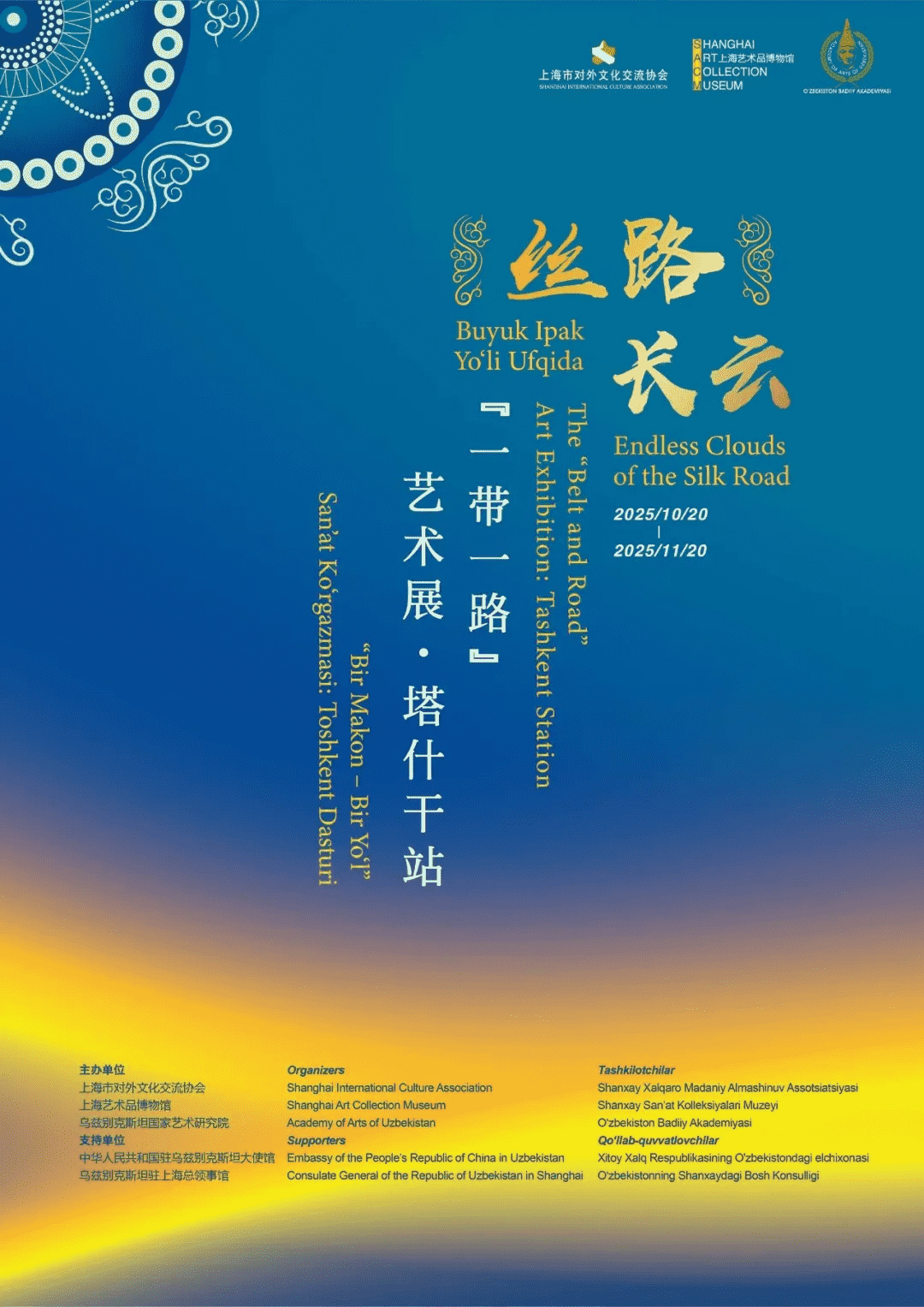 2025年10月20日, “丝路长云——‘一带一路’艺术展·塔什干站”于乌兹别克斯坦国家艺术研究院中央展厅隆重开幕。本次展览由上海市对外文化交流协会、上海艺术品博物馆与乌兹别克斯坦国家艺术研究院共同主办,并得到中国驻乌兹别克斯坦大使馆、乌兹别克斯坦驻上海总领事馆等多家中乌机构的大力支持。