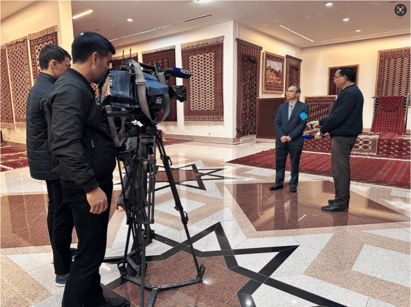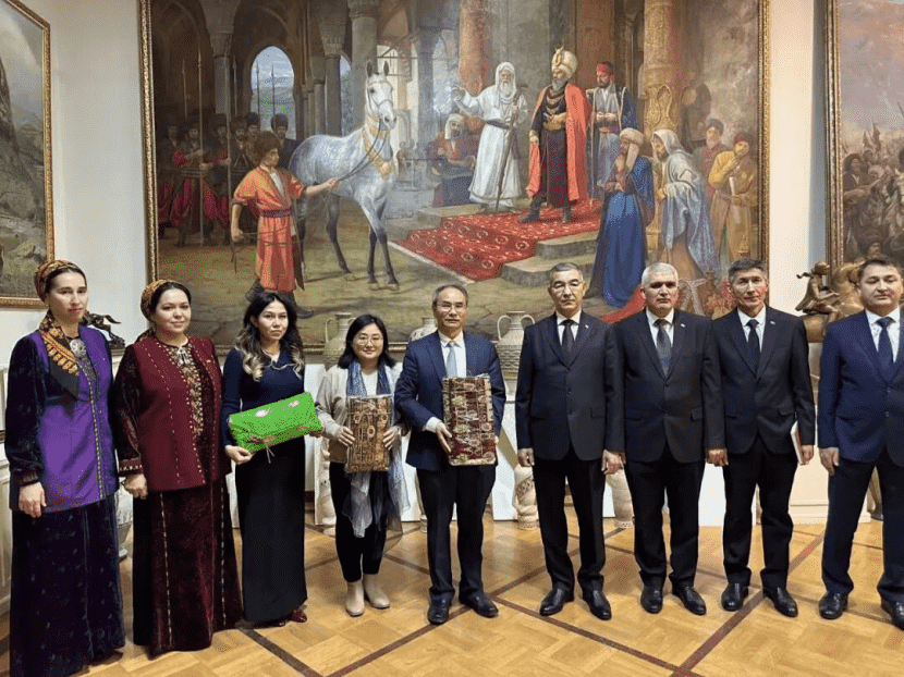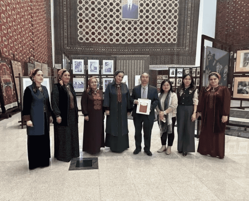 随后,代表团受邀拜访了土库曼斯坦国家地毯博物馆。地毯在土库曼斯坦文化中占据重要地位,被视为民族文化的象征。气势恢宏的地毯博物馆内陈列了超过2,000件地毯展品,包括从17世纪到20世纪的各类地毯。这些不仅展示了土库曼民族的精湛技艺,还蕴含着丰富的文化内涵和审美情趣。馆内收藏有名为《黄金时代》的世界上最大的手工编织地毯,面积达301平方米,重1.2吨;其镇馆之宝是一件1948年制作的地毯,上面绘有与中国传统龙相似的图案,体现了中土文化交流源远流长的历史。