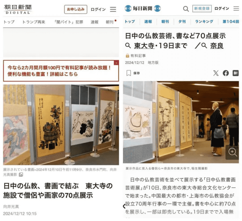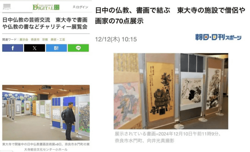本次“共结来缘——中日佛教书画艺术展”产生了广泛的社会影响。中央电视台、新华社、中新网、文汇报、澎湃新闻、新浪新闻、腾讯新闻等中方主流媒体纷纷聚焦展览动态;朝日新闻、每日新闻、奈良新闻、法新社(日语版)等日本和国际主流媒体也对展览进行了充分报道。