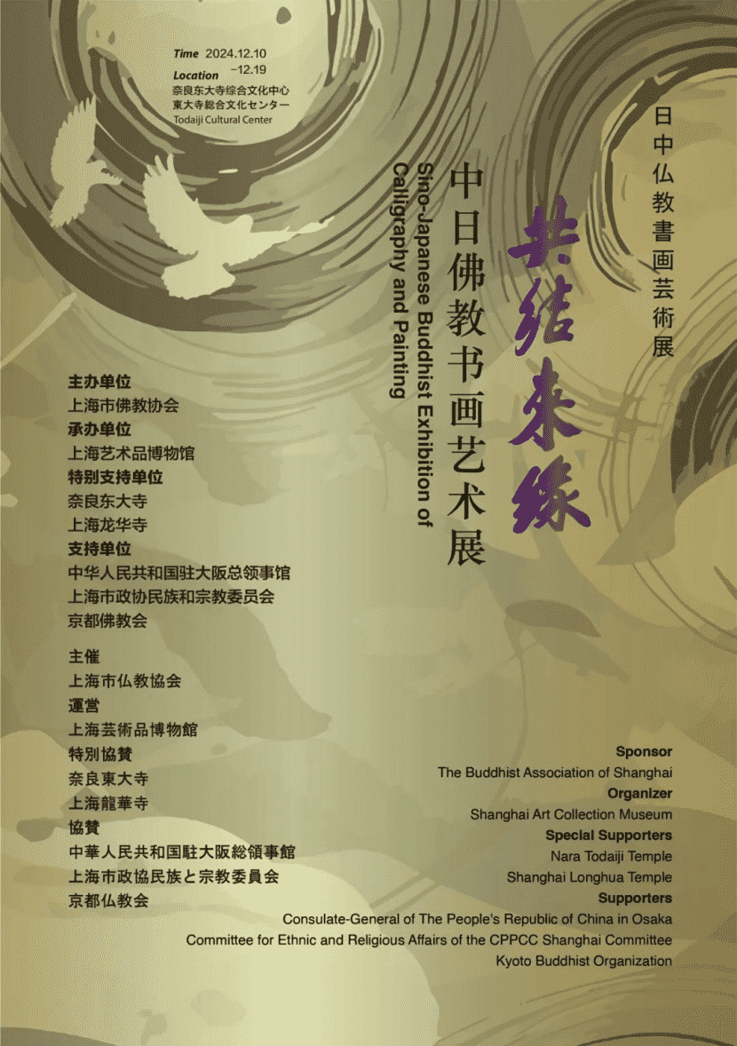 中日两国一衣带水,地缘相近,文化相通。2024年适逢上海市政协成立75周年、上海市佛教协会成立70周年。以此为重要契机,在上海市政协民族和宗教委员会的推动与指导下,2024年12月10日至12月19日,由上海市佛教协会主办,上海艺术品博物馆承办,日本东大寺、上海龙华寺作为特别支持单位,中华人民共和国驻大阪总领事馆、上海市政协民宗委、京都佛教会大力支持的“共结来缘——中日佛教书画艺术展”在日本东大寺顺利举办,并取得圆满成功。(展览报道详见“共结来缘——中日佛教书画艺术展”将于奈良东大寺隆重举办、“共结来缘——中日佛教书画艺术展”在日本东大寺盛大开幕)