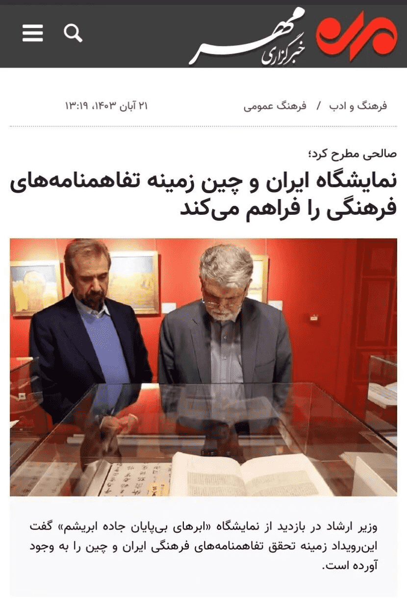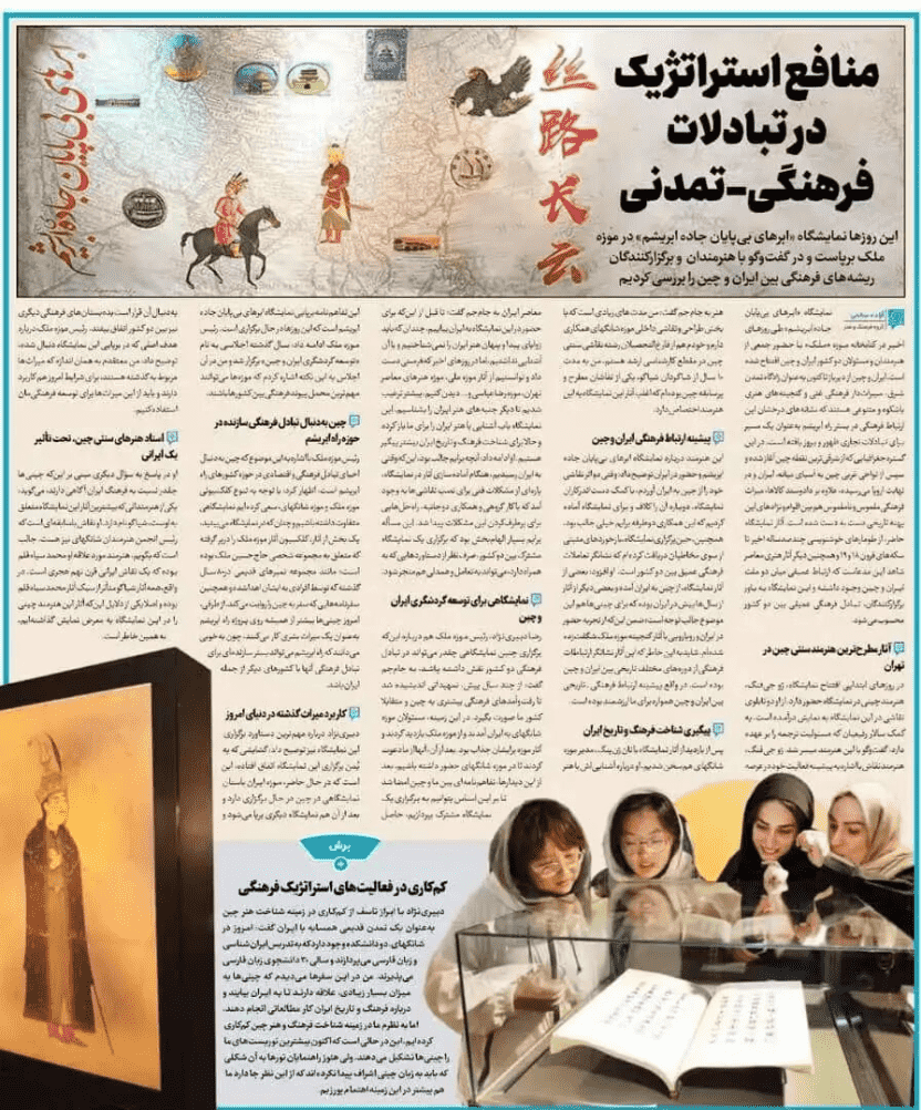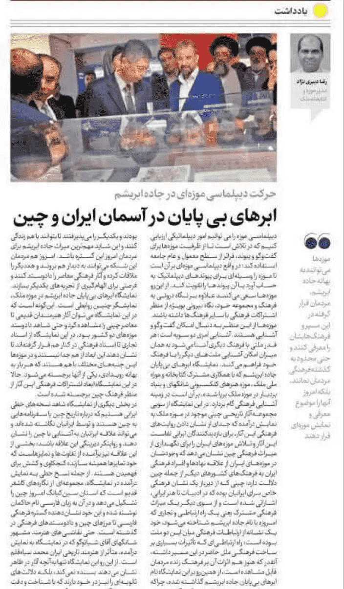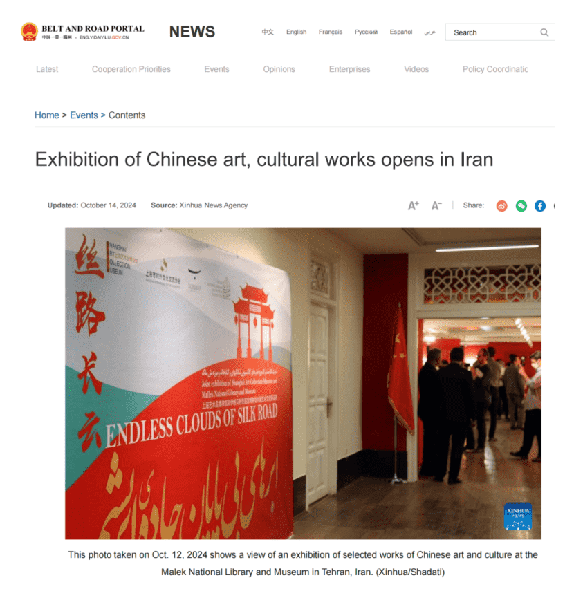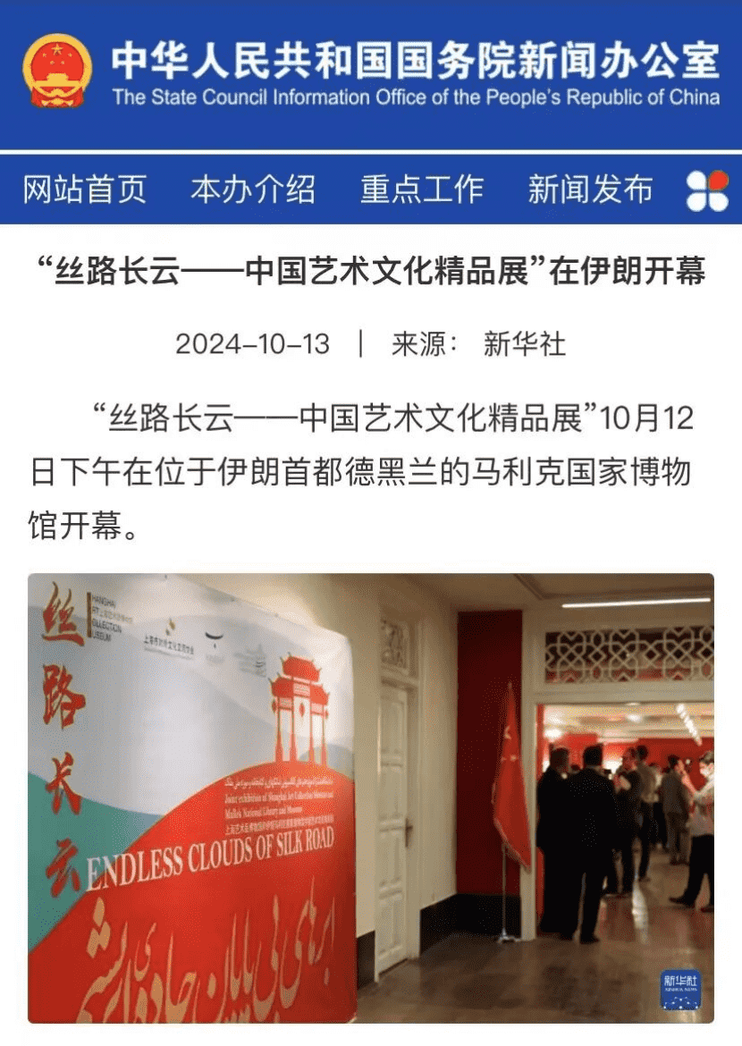 展览也受到了中伊主流媒体的广泛报道与持续关注,继开幕式集中报道后,又有一批机构对这一盛事进行了追踪报道。此前报道详见“丝路长云——中国艺术文化精品展”在伊朗马利克国家博物馆和图书馆总馆盛大开幕。