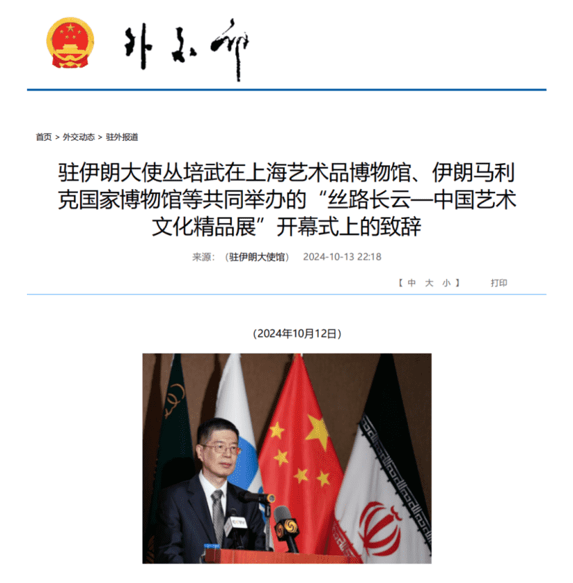 此次展览由上海市对外文化交流协会、上海艺术品博物馆、伊朗马利克国家博物馆和图书馆、伊朗“一带一路”基金会携手举办,并得到了中国驻伊朗大使馆、伊朗驻上海总领事馆等单位的大力支持。展览汇集了一系列中伊丝绸之路文化交流的璀璨成果。(展览报道详见“丝路长云——中国艺术文化精品展”在伊朗马利克国家博物馆和图书馆总馆盛大开幕)