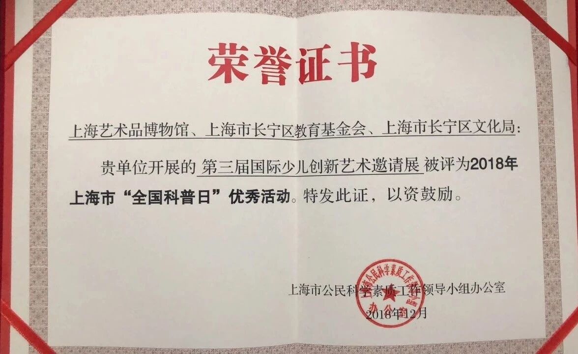 日前,由上海艺术品博物馆等单位承办的“第三届国际少儿创新艺术邀请展”,被上海市公民科学素质工作领导小组办公室评为上海市“全国科普日”优秀活动。