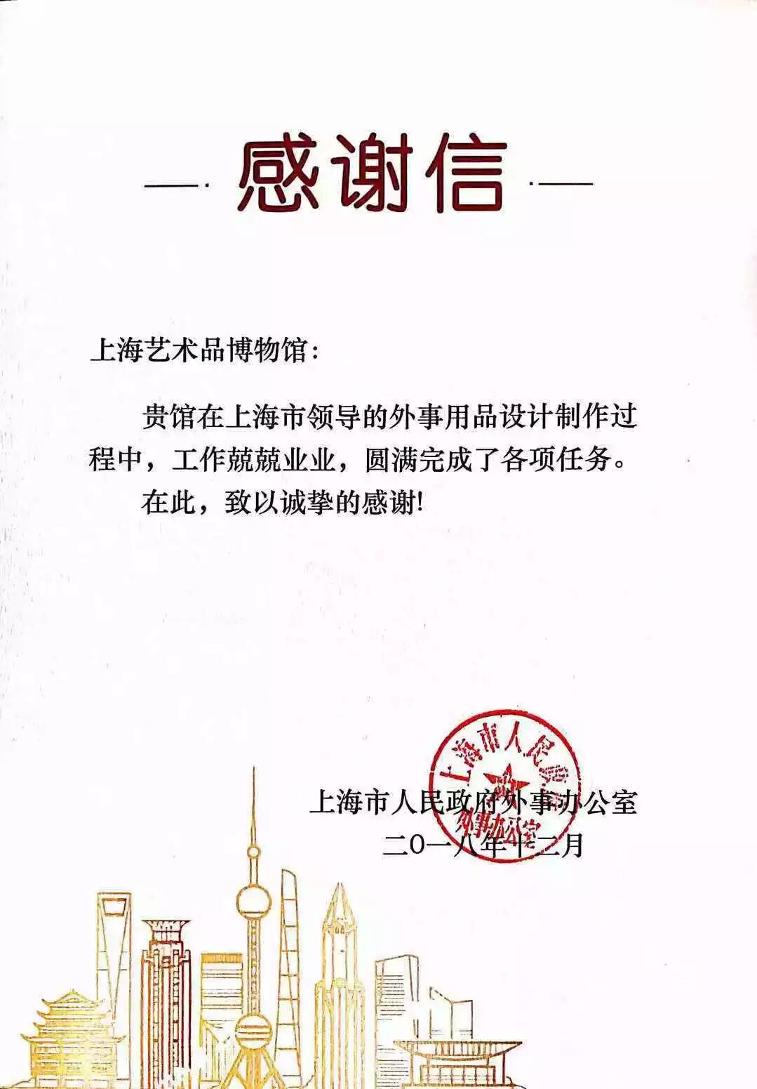 岁末年初,本馆承担了上海市领导的外事用品设计与制作,工作兢兢业业,圆满完成了各项任务,为此收到了上海市人民政府外事办公室特别发来的感谢信。
