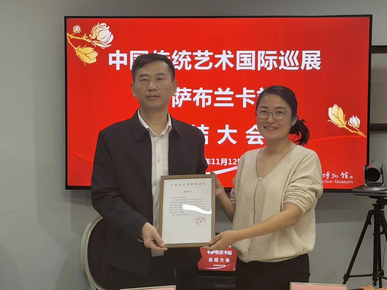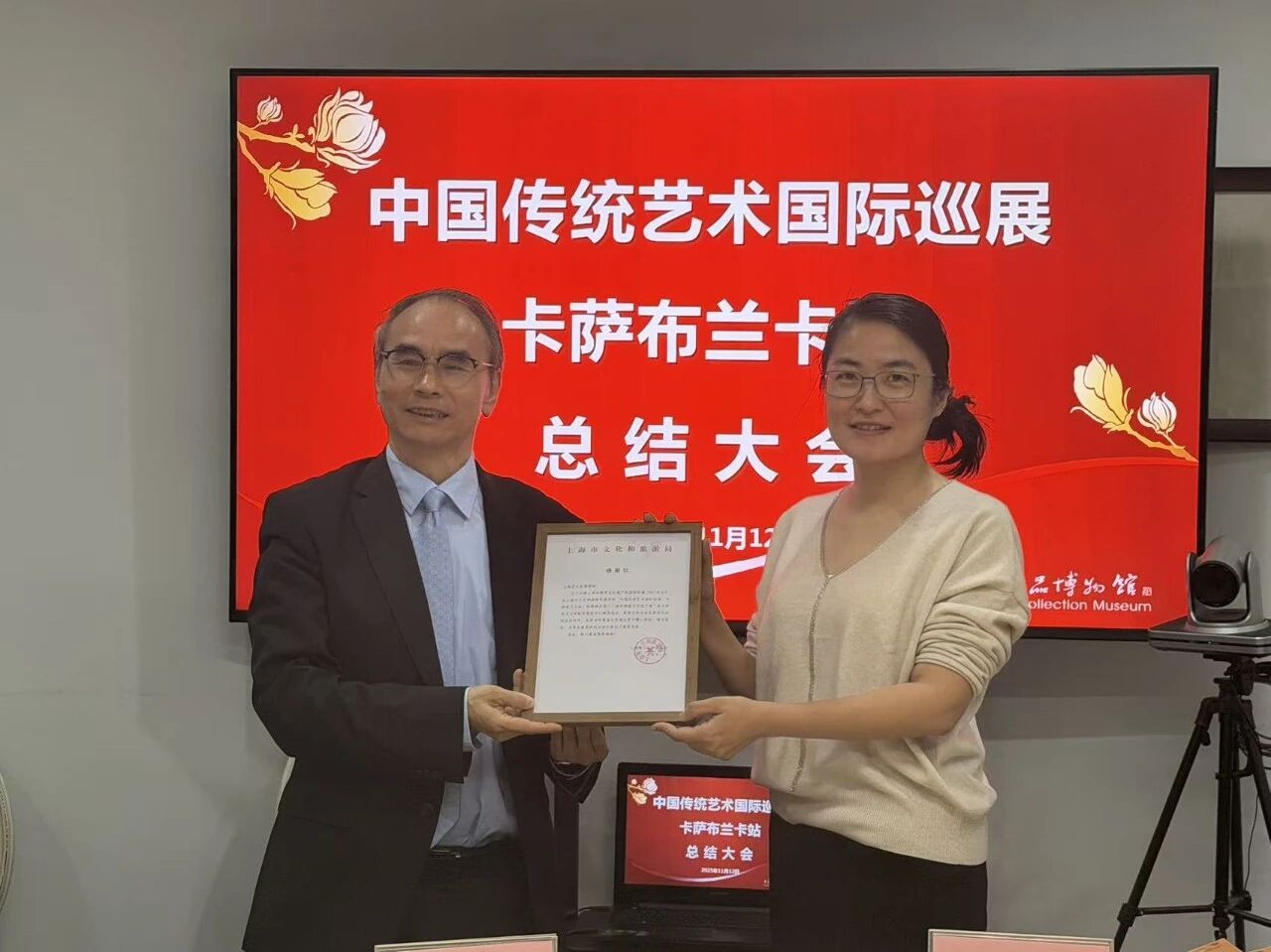 11月12日下午,“中国传统艺术国际巡展·卡萨布兰卡站”总结大会在上海艺术品博物馆成功召开,指导单位代表、上海市文化和旅游局四级调研员晁小卉,主办单位上海艺术品博物馆理事长胡木清、上海工艺美术职业学院校长宋磊、上海市非物质文化遗产保护中心代表胡砚捷、上海艺术研究中心代表吴景春,支持单位上海市社会组织国际交流促进会副秘书长韩强,协办单位上海市松江区文化和旅游局代表汪宏伟等出席了会议。