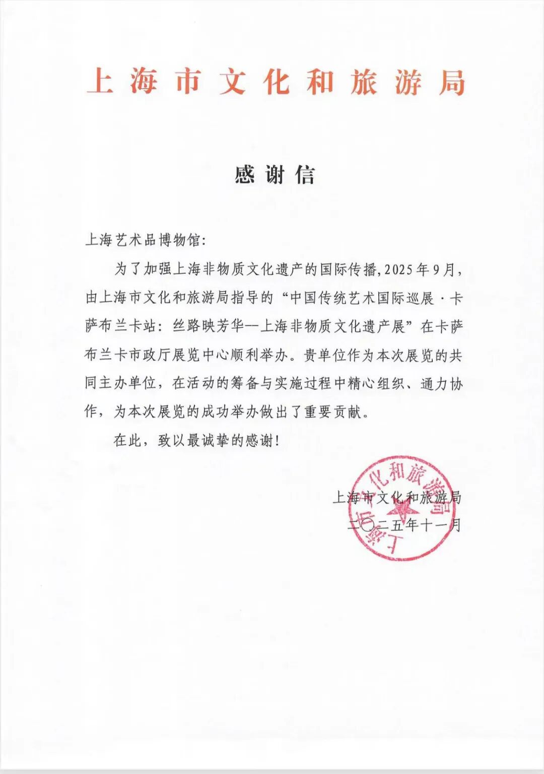 2025年9月12日至10月12日,“中国传统艺术国际巡展·卡萨布兰卡站:丝路映芳华——上海非物质文化遗产展”在摩洛哥卡萨布兰卡市政厅展览中心成功举办,展览在当地取得圆满成功,累计逾五万名观众参观了展览,近百家中外媒体广泛报道了展览的盛况。(报道详见中国传统艺术国际巡展在卡萨布兰卡盛大开幕;“中国传统艺术国际巡展·卡萨布兰卡站”圆满收官)