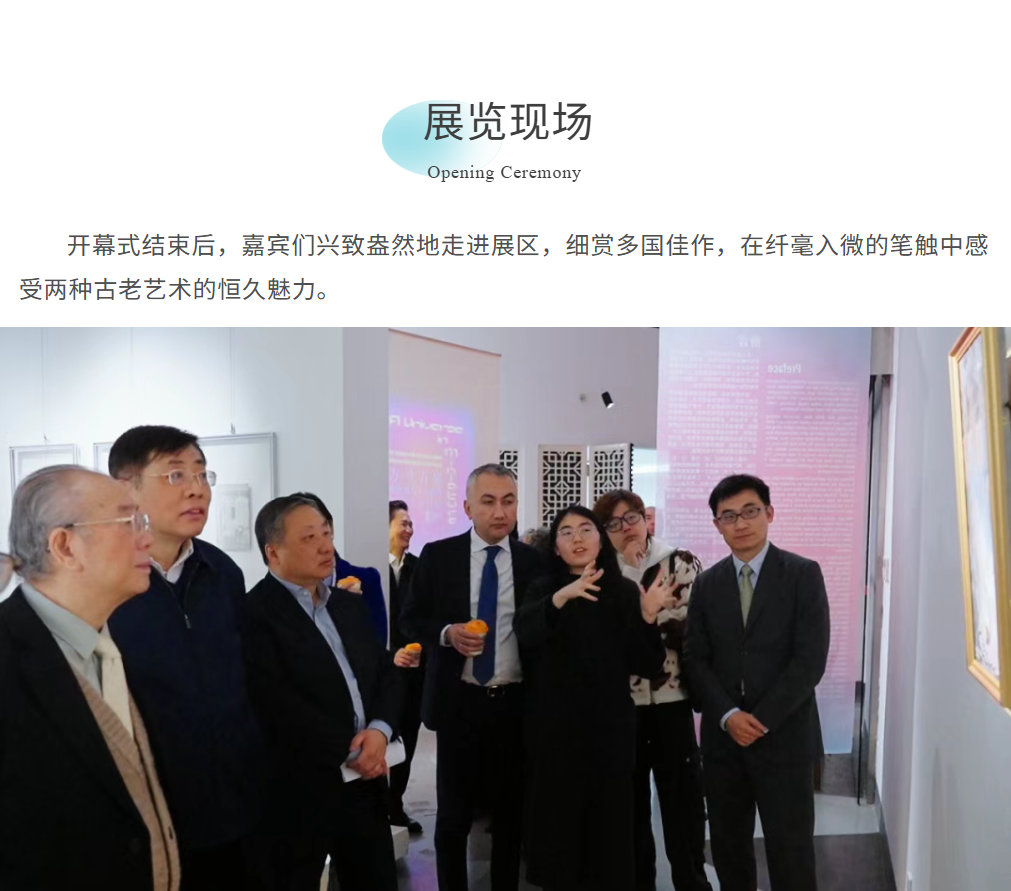 当天的开幕式隆重热烈,贵宾云集。十届上海市政协副主席王荣华,上海市人大财政经济委员会副主任委员、上海市教育发展基金会理事长杲云,上海市人民对外友好协会副会长傅继红,上海市旅游行业协会执行会长张旗,上海市文化和旅游局二级巡视员张枝俏,长宁区文学艺术界联合会主席、长宁区政协原主席温新华;乌兹别克斯坦总统艺术顾问、国家艺术研究院主席阿克马尔·努尔(Akmal Nuridinov)、土库曼斯坦美术家协会主席查里穆拉特•亚兹穆拉多夫(Charymyrat Yazmyradov)、乌兹别克斯坦驻上海总领事伊斯梅洛夫·鲁斯塔姆(Ismailov Rustam)、副总领事库特比丁·乌拜杜拉耶夫先生(Kutbiddin Ubaydullaev) 、乌兹别克斯坦国家东方细密画博物馆馆长,古拉布扎·卡尔什耶娃 (Dr. Gulabza Karshieva);上海市文化和旅游局国际处处长陈可乐、博物馆处处长葛永铭、上海市对外文化交流协会文体处处长杨焱、上海工艺美术职业学院党委书记王静、上海美术家协会驻会副主席兼秘书长丁设、上海艺术研究中心主任沈捷和主办单位上海艺术品博物馆理事长胡木清等众多中外嘉宾共同出席了开幕式。