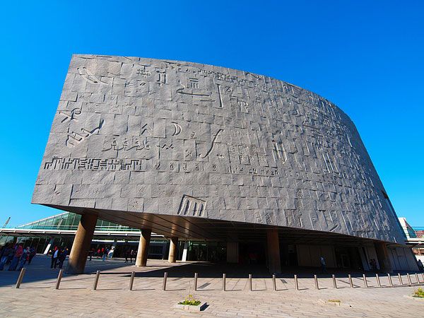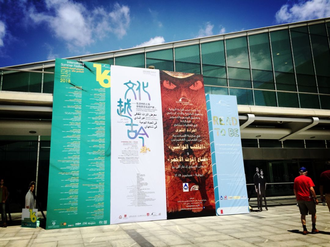 中国传统艺术国际巡展·亚历山大站的巨大海报矗立在埃及亚历山大图书馆的中央广场上