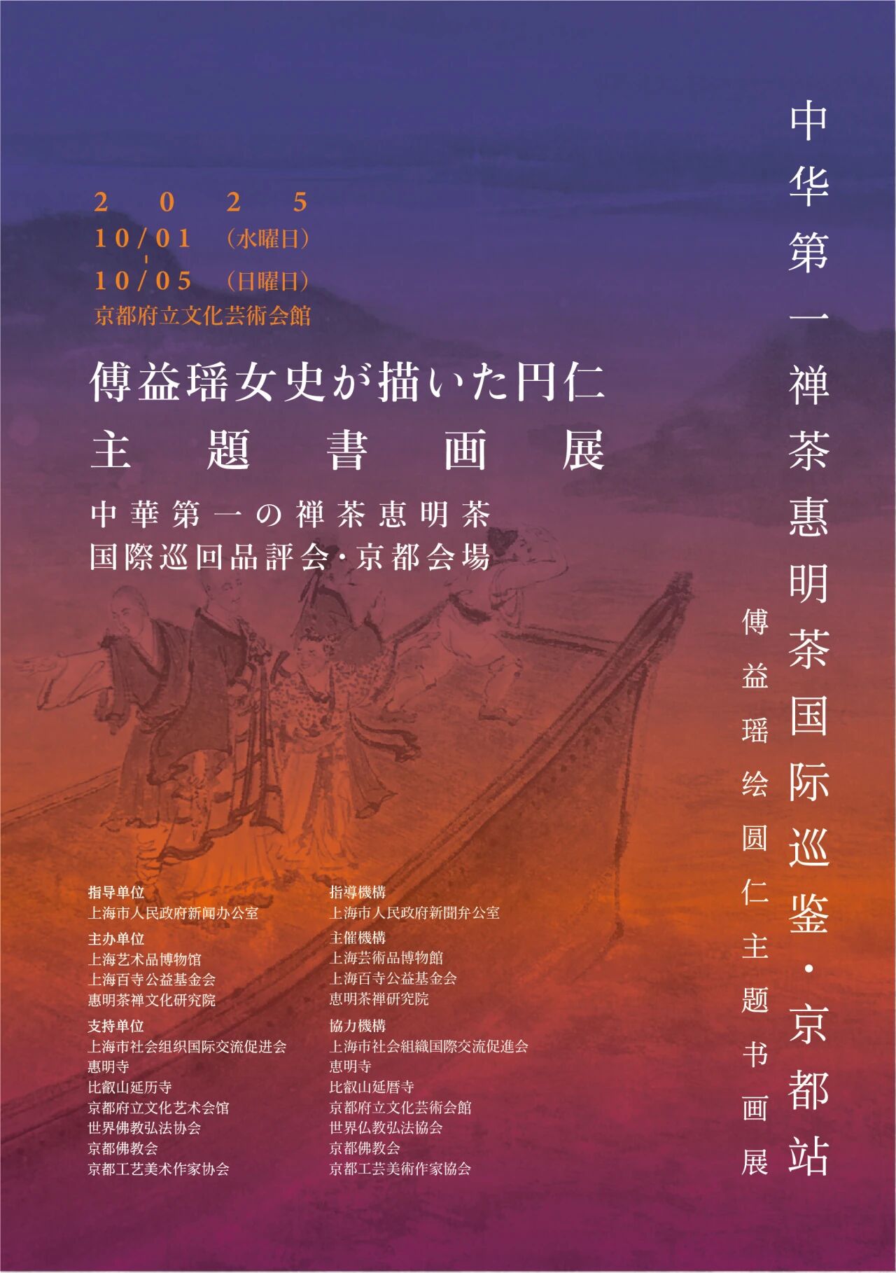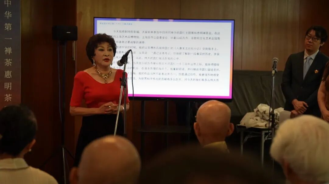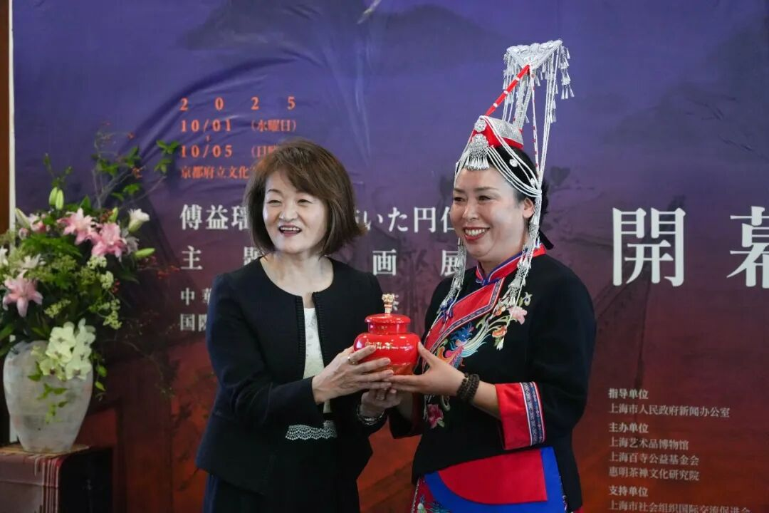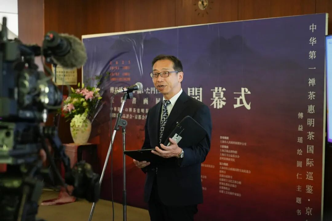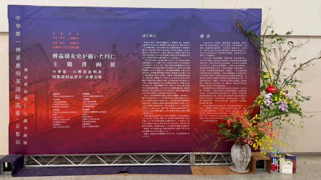 2025年,恰逢圆仁入唐求法1180周年纪念,又值大阪世博会圆满落幕之际,为开启中日文化交流新篇章,由上海市人民政府新闻办公室指导,上海艺术品博物馆、上海百寺公益基金会、惠明茶禅文化研究院联合主办的“傅益瑶绘圆仁主题书画展”暨“惠明禅茶国际巡鉴·京都站”在日本传统文化中心、千年古都——京都顺利开幕。