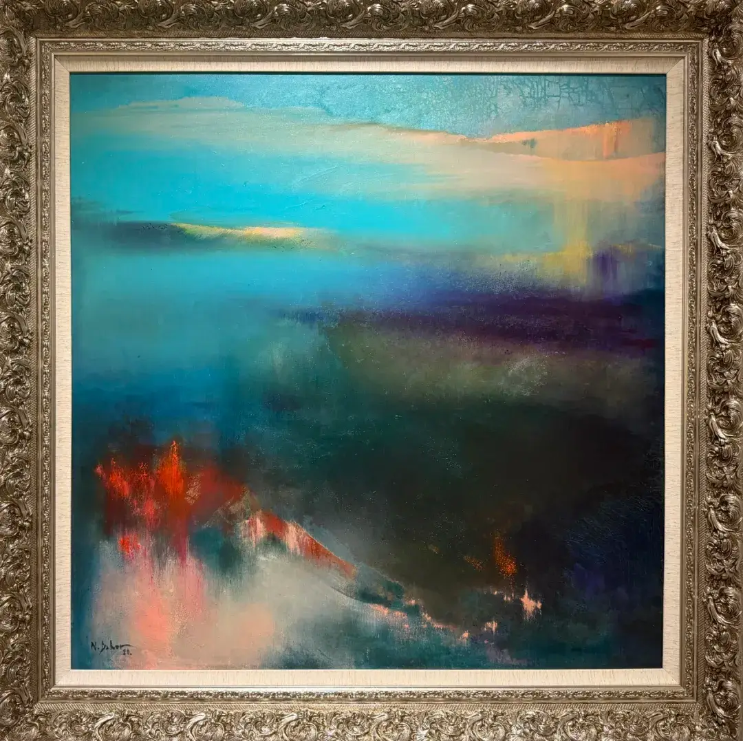 黎巴嫩艺术家以印象派的手法,描绘了湖畔的景象。作品以蓝绿冷色调为主,融合橙红色的光晕,营造出深邃又富有诗意的氛围。色层的叠加呈现雾气、海面、云层、晚霞等自然意象,模糊抽象,却蕴藏强烈的空间感。