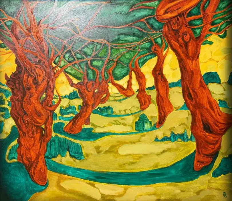 艺术家以交错盘旋的树冠象征思想的延展与纠结,呈现意识在时间深处不断发散、汇聚的动态。画面下方,在云雾般的金色光影中,土库曼斯坦的古迹遗址静静矗立于树根之间。树木象征生命与思考的持续生长,古迹象征历史的积淀与民族文化的根脉。通过自然意象与象征化元素的融合,艺术家以具象的方式呈现出绵延不绝的历史脉络以及复杂而深远的内心思绪。