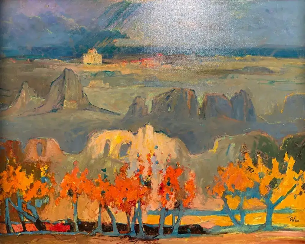 作品以鲜亮的橙黄树群与远方冷色调的遗迹形成强烈对比,将观者的视线从充满生命力的前景逐步引入梅尔夫古城辽阔而静默的废墟。梅尔夫位于古丝绸之路要道,是中亚历史上最繁盛的绿洲都市之一。艺术家以富有表现力的笔触描绘其残存的城墙与地貌,让古城仿佛在时间的薄雾中浮现。