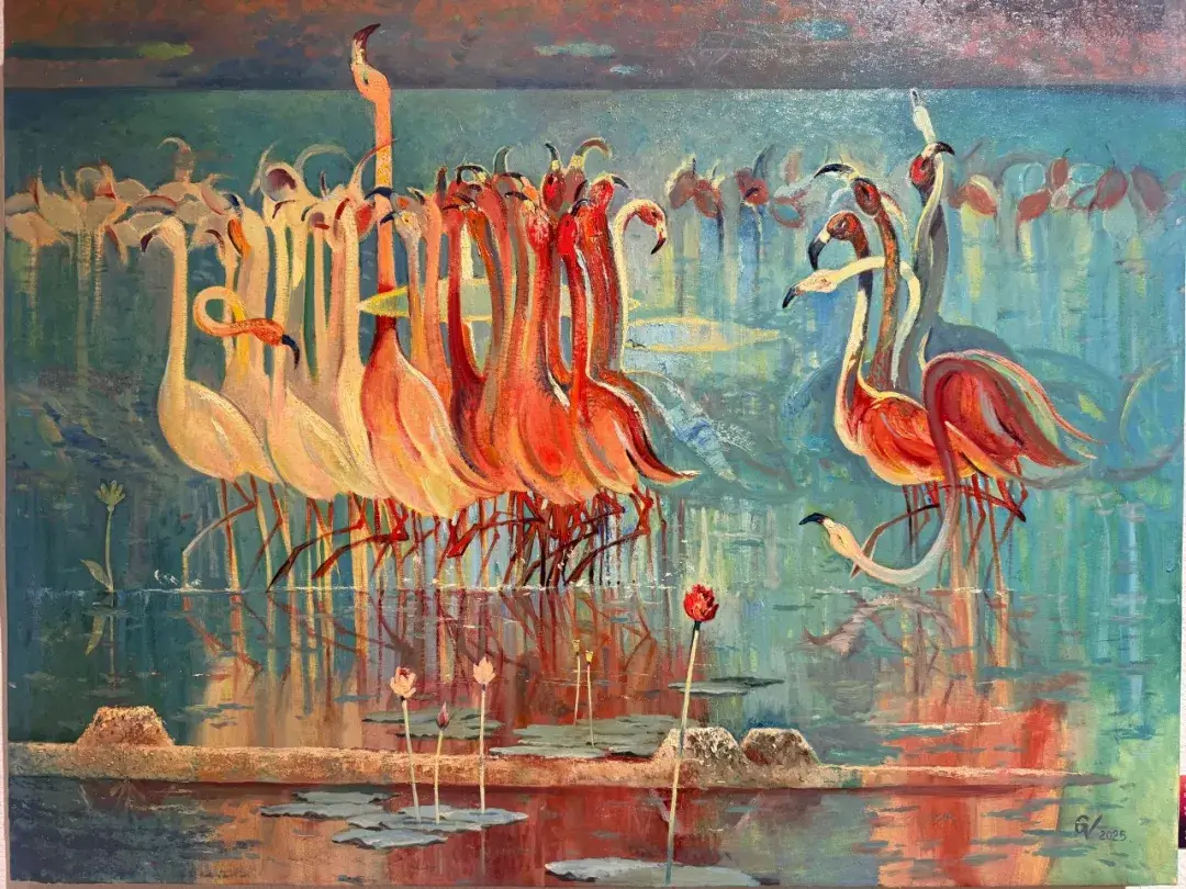画面以成群的火烈鸟为主体,姿态优雅,色彩鲜明。艺术家敏锐地捕捉迁徙路途中短暂停留的火烈鸟,将自然观察与装饰性线条结合,在蓝绿色水面与暖红色鸟群的对比中创造出富有韵律的视觉节奏,象征生命的协调与群体之美。