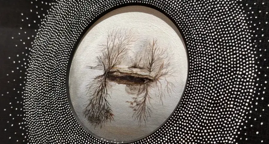 作品以圆形画面框住一处冬日的静水景象:枯枝倒映在水面上,天地仿佛在无声的镜像中融为一体。环绕画面的密集白点如宇宙星尘般扩散,从中心向外辐射,象征自然之外宏大而静默的宇宙。