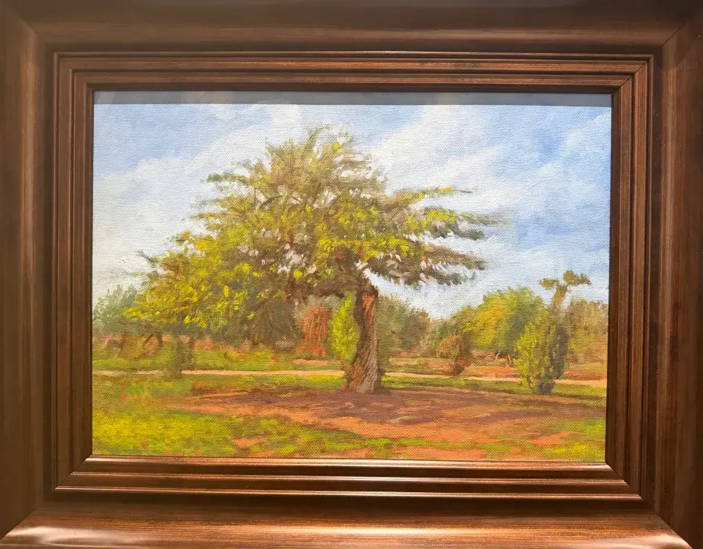 在科威特城的舒瓦克花园散步时,艺术家被这棵树的美感深深吸引。郁郁葱葱的绿树层次、点缀着轻盈云朵的蓝天,以及洒落在地面的淡紫色阴影,共同构成了让他驻足的瞬间。艺术家在现场连续写生三日,完成了这幅作品。