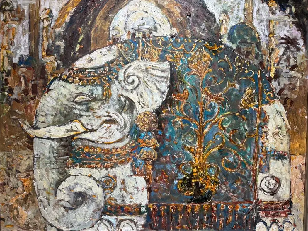这幅作品以印度阿格拉地区雄壮而神圣的大象为主角,象身饰以繁复华丽的金彩纹饰,背景融入中亚建筑元素,笔触与强烈的色彩象征力量、庇护与神圣性。