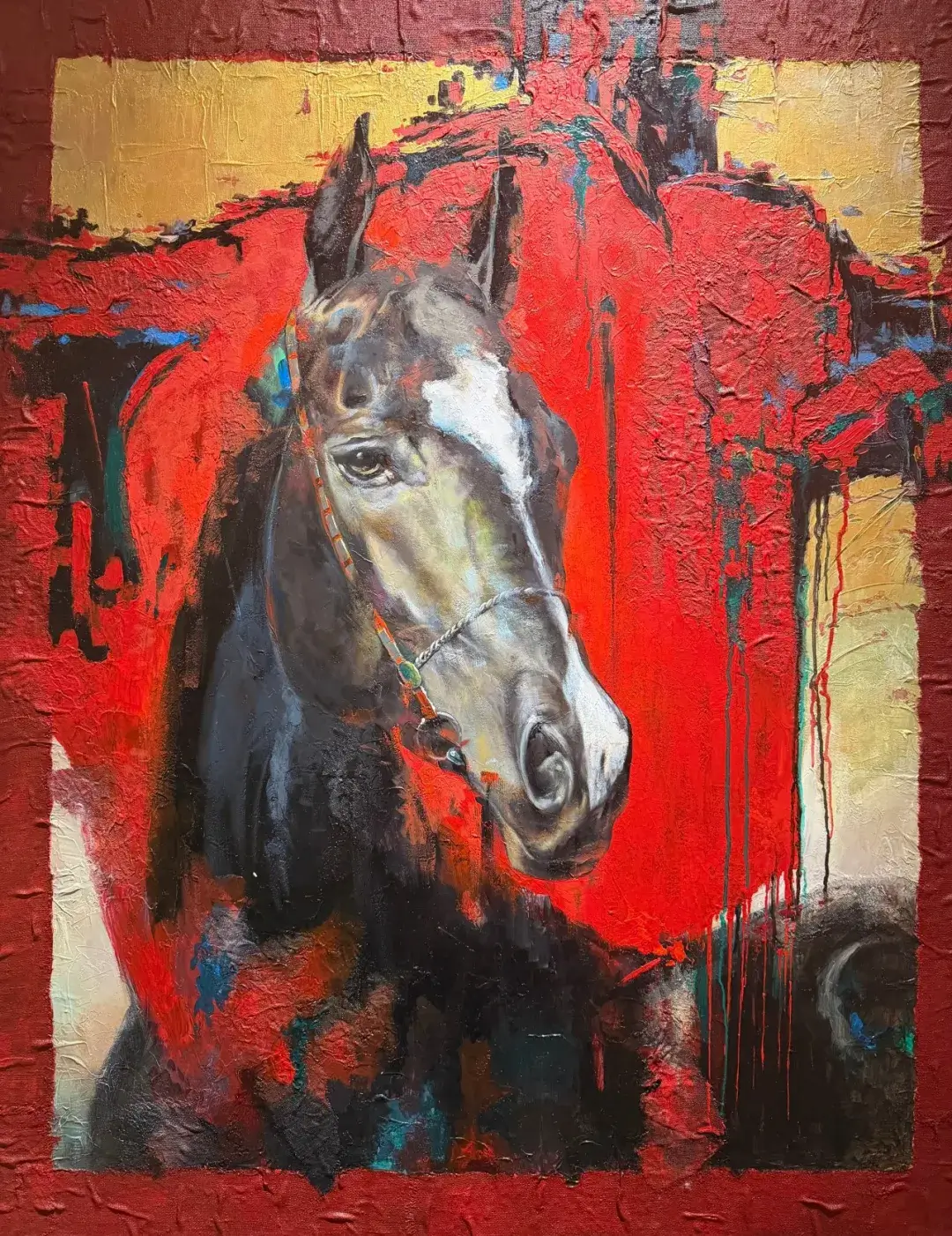 这件作品以土库曼斯坦最具代表性的古老马种——汗血宝马(Akhal-Teke)为核心意象。汗血宝马因其光滑如金属般的皮毛、卓越的耐力与高贵的姿态而被誉为“世界上最美的马”。画家以强烈的红、金色调构建戏剧化的背景,厚涂肌理如火焰翻腾,烘托出汗血宝马天生的爆发力与尊贵气质;马的头部以写实手法刻画,目光深邃坚毅。呈现了土库曼民族的文化图腾。