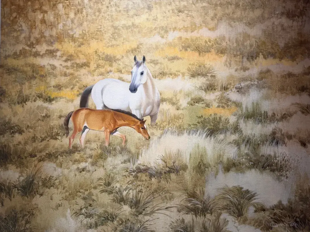 该作品由哈萨克斯坦国家艺术联盟主席所作,以温柔的笔调描绘白马与幼驹在草原中信步的场景。浅金色的草地如绒毯般铺陈,马匹的姿态放松悠闲。作品体现游牧文明中对生命、族群与自然循环的深刻理解。