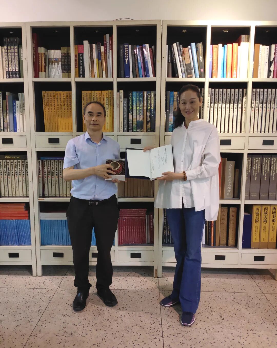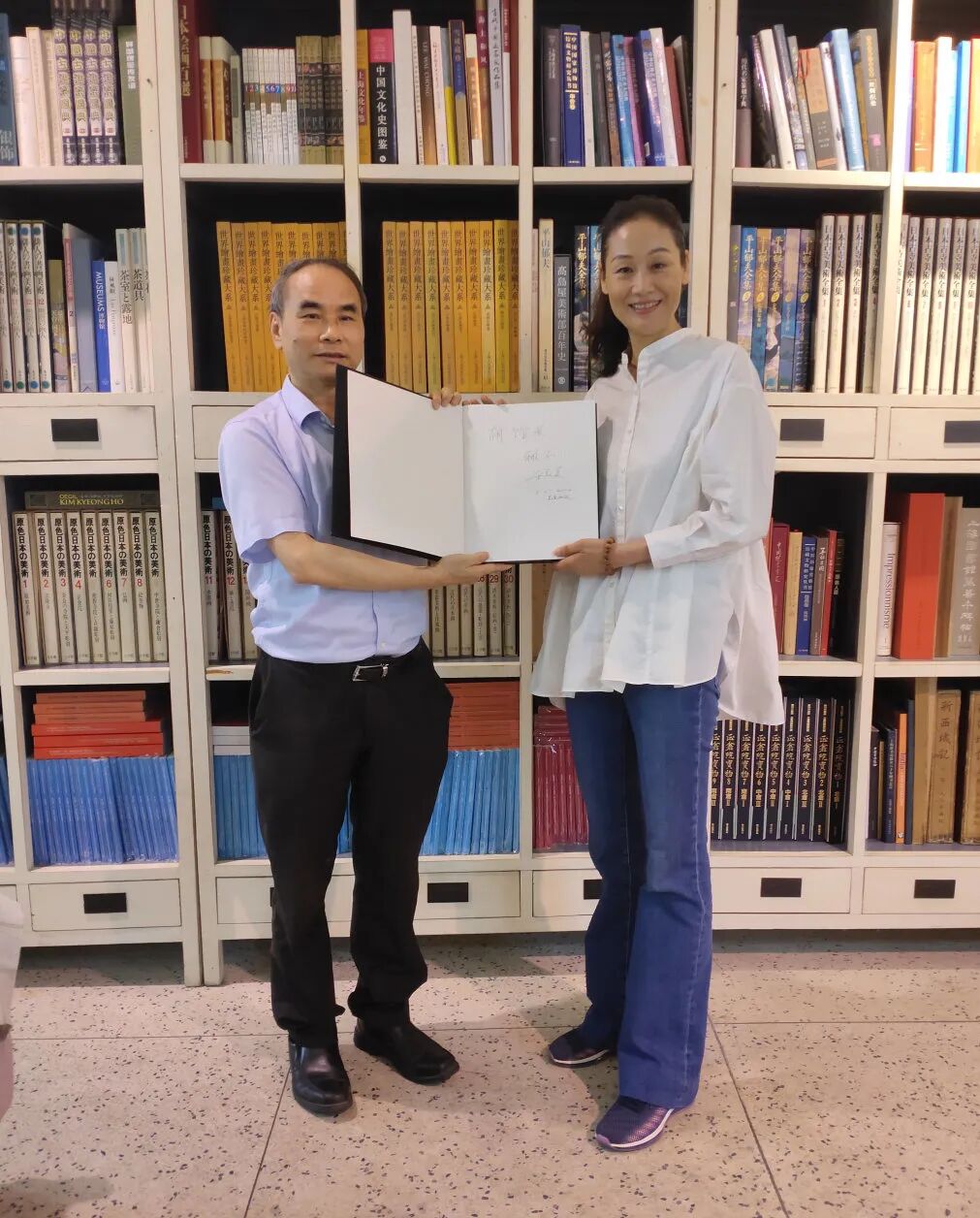 宋美英女士向本馆赠送亲笔签名的陈逸飞画册;我馆胡木清理事长回赠了主编的《梁思成林徽因影像与手稿珍集》和馆藏林徽因作品文创纪念品