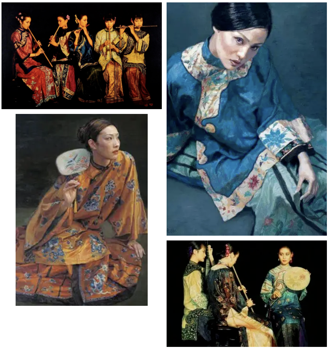 其绘画更是通过唯美而精致的画面、炉火纯青的技法,将写实画风推往极致。如改革开放前的红色经典、旅美后的“西方乐手系列”、90年代的“仕女系列”、“上海旧梦系列”及“西藏系列”等。