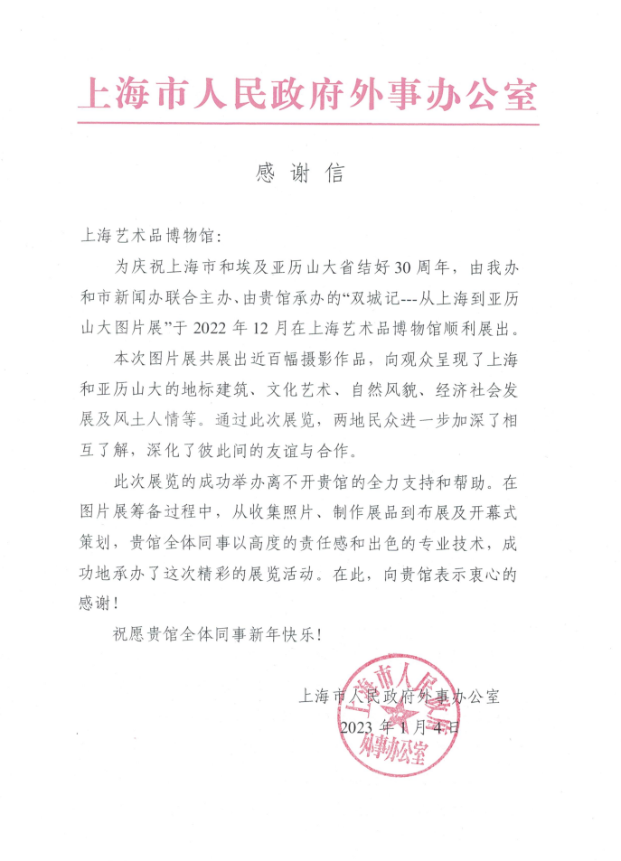对于活动的成功举办,上海市人民政府外事办公室特别给本馆发来感谢信。
