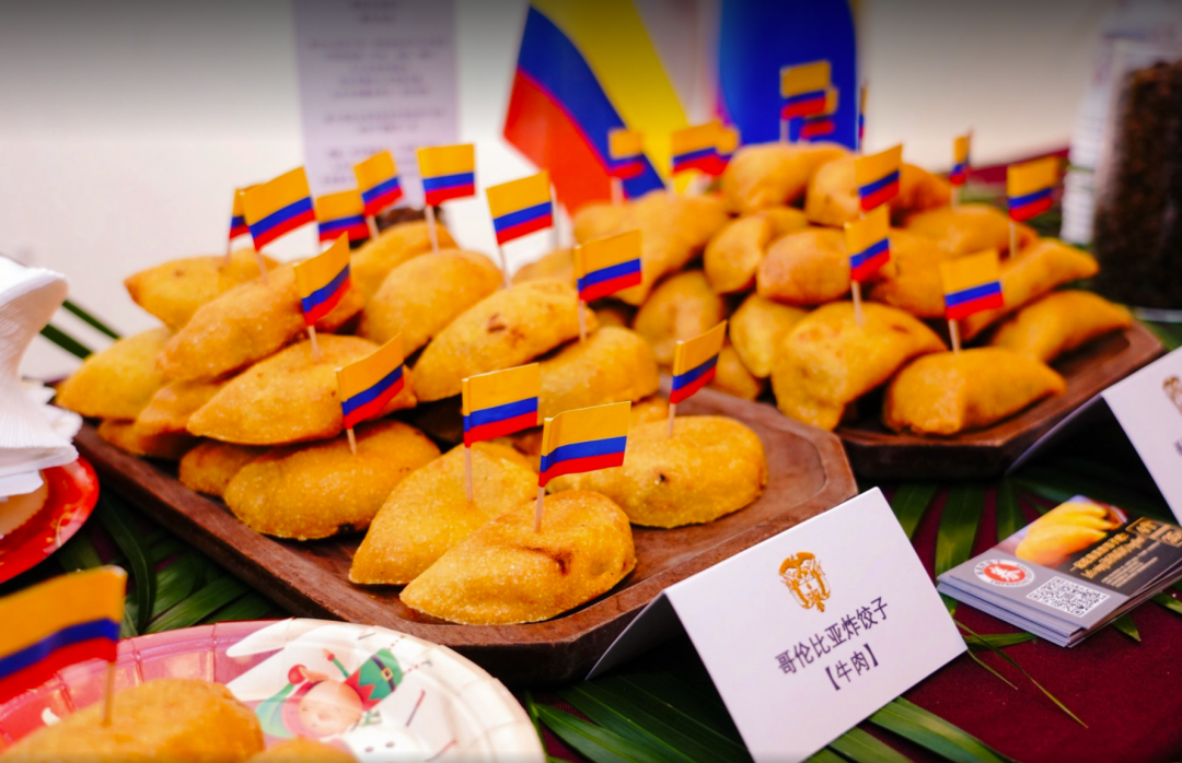 现场嘉宾品尝哥伦比亚咖啡和传统饺子,兴致勃勃地参观正在馆内举办的“艺海丝路”展览