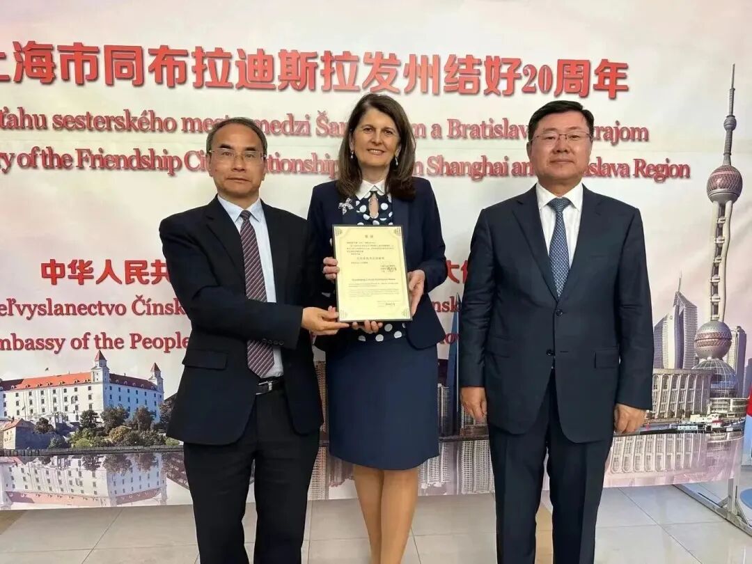 在孙立杰大使的见证下,胡木清理事长向为上海市与布拉迪斯拉发州文化交流做出杰出贡献的斯洛伐克驻上海总领事馆原总领事伊凡娜(Ms. Ivana Vala Magatova) 颁发了“文化交流杰出贡献奖”