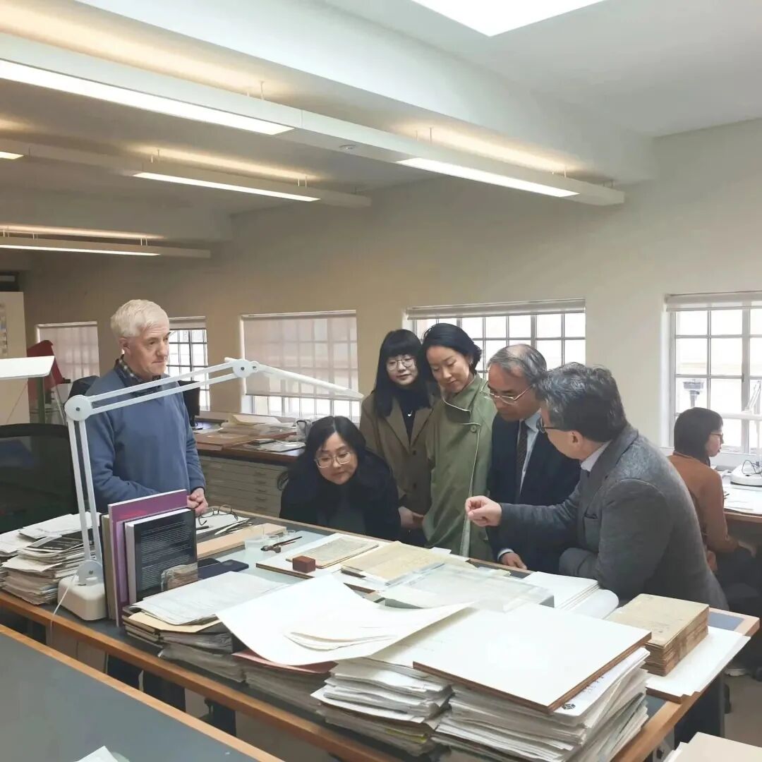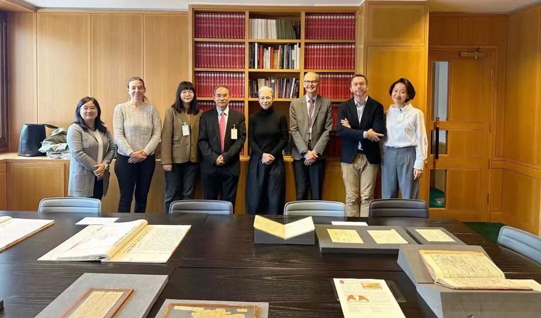 5月2日上午,代表团应邀前往大英图书馆进行访问。大英图书馆派出了9人的接待团队,其中包括馆藏及策展主任Xerxes Mazda、亚非馆藏主任Luisa Elena Mengoni、东亚馆藏主任Hamish Todd、东亚馆藏主策展人Sara Chiesura、中国馆藏策展人Emma Harrison、展览及合作经理Amy Sillmann、国际交流部主任Marcie Hopkins等,并精心提前准备了世界上最早的印刷珍品大唐咸通九年(公元868年)的《金刚经》、《永乐大典》书法及建筑卷、古希腊莎草纸文献等极为珍贵的文献原件。随后双方进行了工作会谈,就未来共同举办展览、进行学术交流活动等方面进行了深入的探讨。