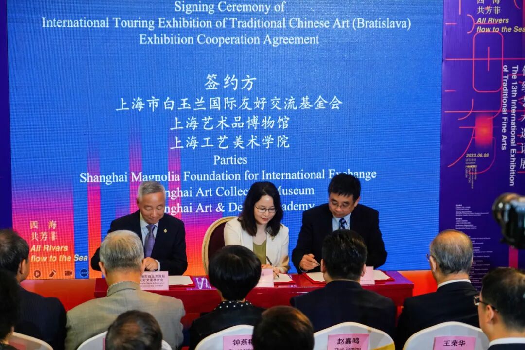 上海市白玉兰国际友好交流基金会副理事长、秘书长范宇飞,上海艺术品博物馆执行馆长李水清与上海工艺美术学院党委书记许涛共同签署中国传统艺术国际巡展(布拉迪斯拉发站)合作意向书