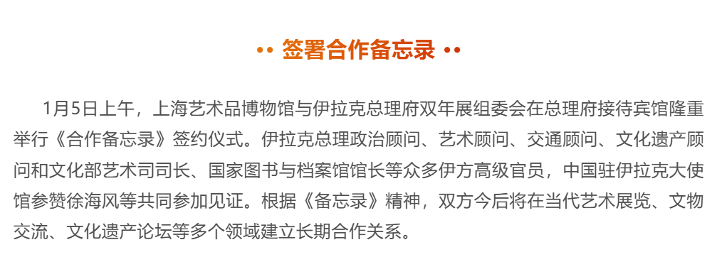 2026年1月4日至11日,应伊拉克总理府办公室和科威特王室邀请,上海艺术品博物馆代表团先后赴上述两国开展为期8天的文化交流访问。代表团围绕着文物和当代艺术交流展、艺术收藏研究、文博机构交流等核心议题,与两国政府文化部门、国家级博物馆、重要文化机构及王室代表进行了多场深入务实的会谈,签署了相关合作文本,为后续合作奠定了坚实基础。