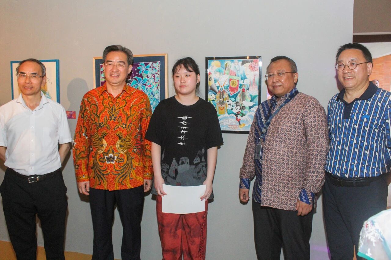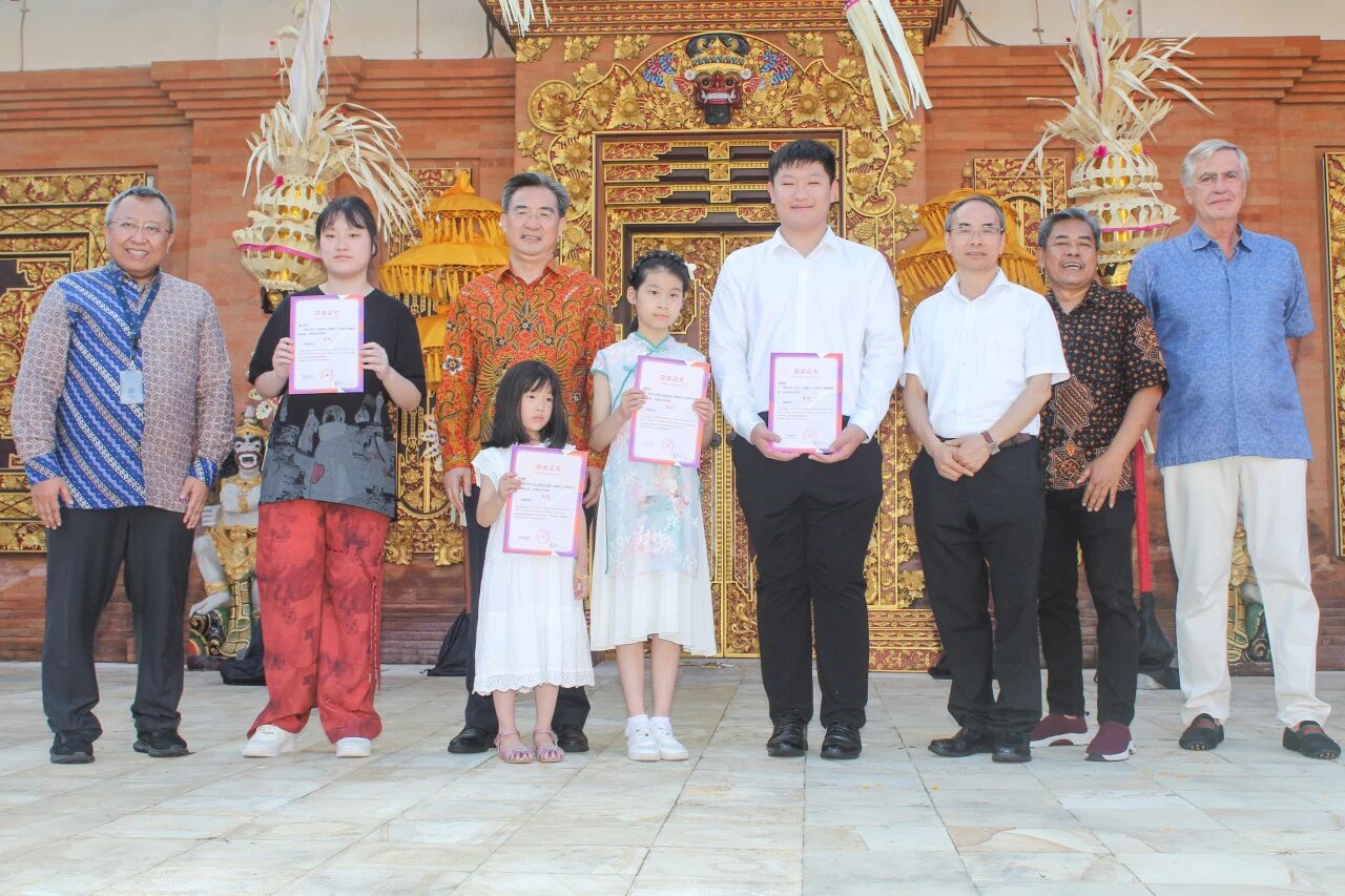 开幕式上,印尼旅游与创意经济部副部长穆罕穆德·希玛姆,中国驻登巴萨总领事朱兴龙,印尼艺术协会总主席、日惹艺术学院校长蒂姆布·拉哈乔,上海艺术品博物馆理事长胡木清,太平洋博物馆馆长菲利普·奥吉尔,分别为国际少儿创新艺术邀请展巴厘岛巡展”的获奖代表靳人阿予、曾思齐、朱星瞳、柯辰霖颁发了获奖证书。